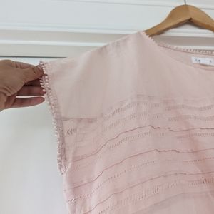 super beautiful light pink blouse with so many gorgeous details. boxy styling, peplum bottom, Ric RAC trim, threading details. this brand is sold at Anthropologie. there are a few small stains and thread pulls, but great opportunity to own this brand for a lot less.