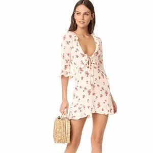 Ties close the cutout bodice. 3/4 sleeves. Hidden side zip. Unlined.
