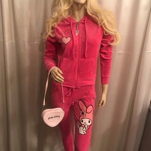 Adorable quality juicy couture vintage pink tracksuit made from the same quality velour high in cotton content so itโs super soft and bright custom huge my melody back logo and hot pink heart ๐ crystal matching front leg logo and heart crystal front Jodie heart and cute pink my melody zipper charm and crystal drawstring charms on the cute cuffed joggers giddier fits the same as a juicy sm bottoms fit same as juicy xs ๐ super cute custom vintage one of a kind ๐see my closet for tons more hello kitty and my melody custom treasures ๐always open to offers ๐new never worn just washed several times to ensure transfers and crystals are stable in wash ๐ inside out in cold ๐
