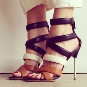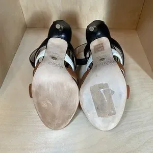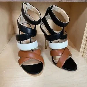 Insanely sexy leather heels! Worn once! Dangerous metal stiletto with brown, white, and black straps. Genuine leather, made in Italy.