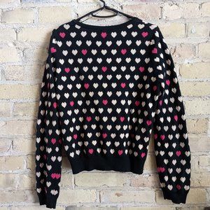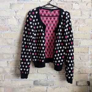Cute and cozy heart patterned cardigan from H&M - Divided. Black button up sweater with rows of cream and pink colored hearts. Size 10. 100% cotton. Great condition.