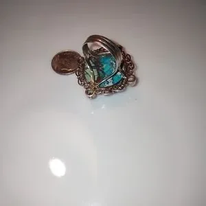 Large Round Turquoise style ring. Filagree around the outside with 4 smaller stones. A purple, blue, green and yellow. small circle stones in a square shape around the circle. Pretty blues and gold in center stone. Don't know if it is real or lab created. I believe it's a 7 1/2.