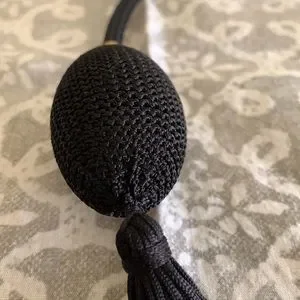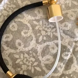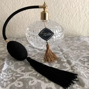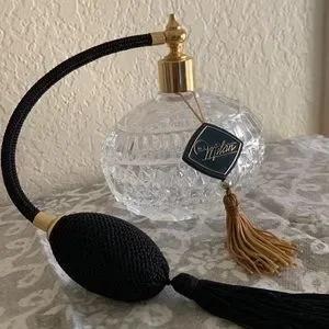 Appears unused; Heavy cut crystal glass design; Gold accents; Black tassel and working bulb spray attachment; Approximately 5” wide