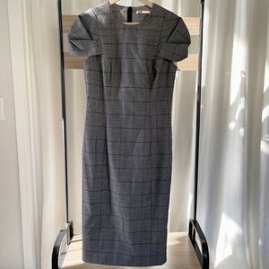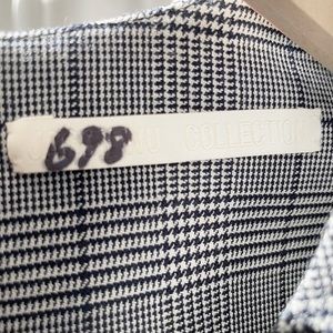 Black and white plaid color with a black polka dot lace overlay over the dress. Midi length with a slit on the bottom in the back.