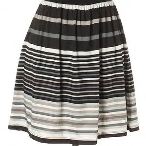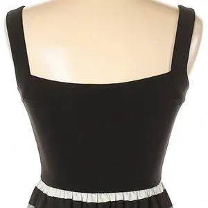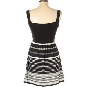 BeBop Black and Gray Striped Mini Apron Dress, has thicker flat shoulder straps, and a slightly low V-neck front. Solid upper with striped lower. Some stretch for a more comfortable fit.