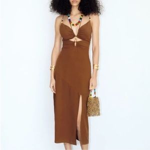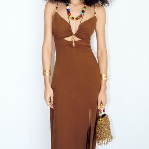 V-neck dress with straps with appliqués. Back wrap detail. Side slit at hem. Back hidden in-seam zip closure.