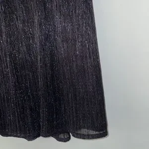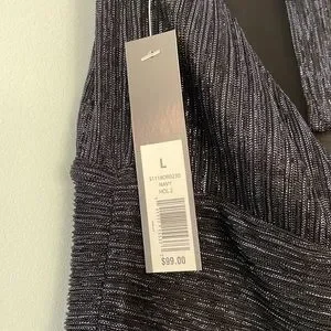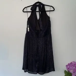 This Limited dress has never been worn and still has tags. Features a halter neck that ties in the back. Silver sparkle threads are inter woven into the black material. There is an inner lining as well. Size Large. 56% polyester 44% metallic