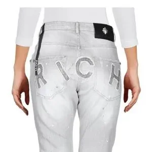 - Details: denim. stained effect, rhinestones, brand logo, solid color, colored wash, high waisted, front closure, button, zip