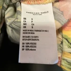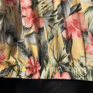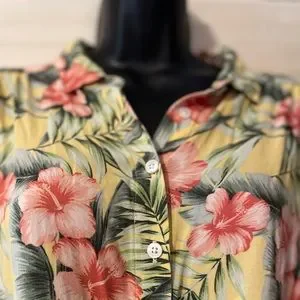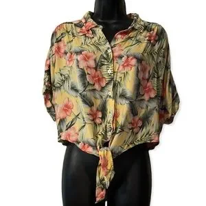 American Eagle Outfitters adorable cropped Hawaiian print top! Yellow with Pink/Coral Hibiscus flowers 🌸 and green palm leaves. Button down and ties at center. The back has a cinched hem for nice stretch and unique look. Pleating down back. Perfect for that tropical vacation, a cruise for the dress theme days, or luau party! Very soft, 100% viscose.