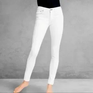 + OTHER DETAILS: Mid-rise waistline. Ankle length. Form fitting with lots of stretch. Comfortable and soft. Thick enough that they're not see-through but black may show through somewhat. 5-pocket style that are functional. Functional back welt pockets with beige threaded logo. Striated texture to the denim material. Belt loops. Finished hem. White stitching throughout except there's contrasting black stitching around the waist button. Branded dark rivets for contrast detail. Made in USA.