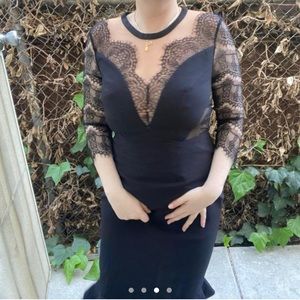 Three Floor black lace and mesh cutout sexy little black evening dress. Small slit in the back to a mermaid tail style bottom midi dress with three quarter sleeves. Tags still on it