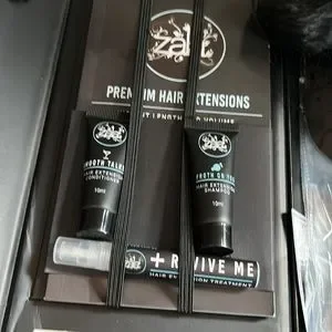 Comes with travel size shampoo and conditioner and treatmeant for hair extensions