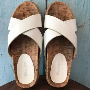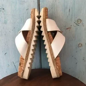 Wanted white sandals with criss-crossed straps, cork & white soles, size 8