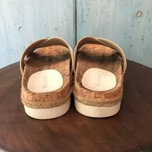 White summer sandals with criss-crossed straps by Wanted. Comfy contoured cork foot pad and 1-1/2” white rubber soles with rope trim. Worn just a few times. Size 8.