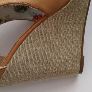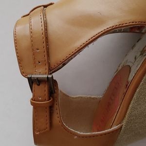 Tan with beige cloth covered 1 inch platform and 4 inch heel