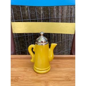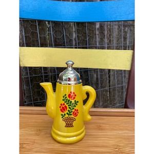 This glass coffee/teapot is yellow with a floral pattern in front. It's about 5.5" in height and 4" wide. The bottle is full with 5 oz. of foaming bath oil in it. Seems like it's never been used. This is over 30 years old, so use with caution....