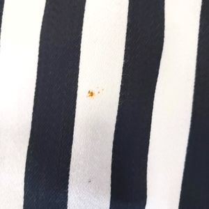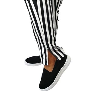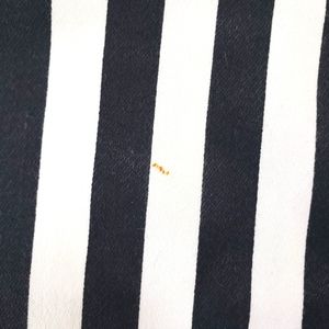 By Junkfood Black & White Strip Pants. Size XXL. Stripe pants with black elastic band going around left, right & back waistline, & slits on bottom hemline. Flaws: two teeny marks on mid-front of both legs. Measurements are approximate. Pants in good preowned condition.