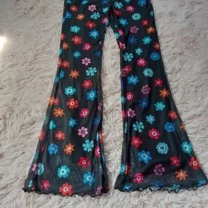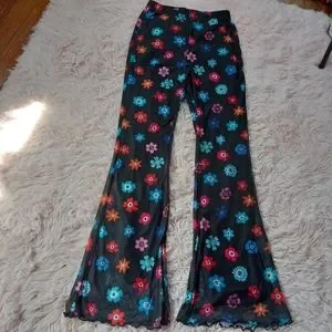 super trendy aesthetics, these fun fit and flare bellbottom leggings are so comfy while still being ridiculously cute! eye catching flower power hippie chick retro print crazy sexy cool and on trend, making a rad statement. lettuce edging around bottom of bellbottoms and the pants feature a mesh overlay giving them a unique style! bundle w one other item for auto 20% off discount 😵🤌❣