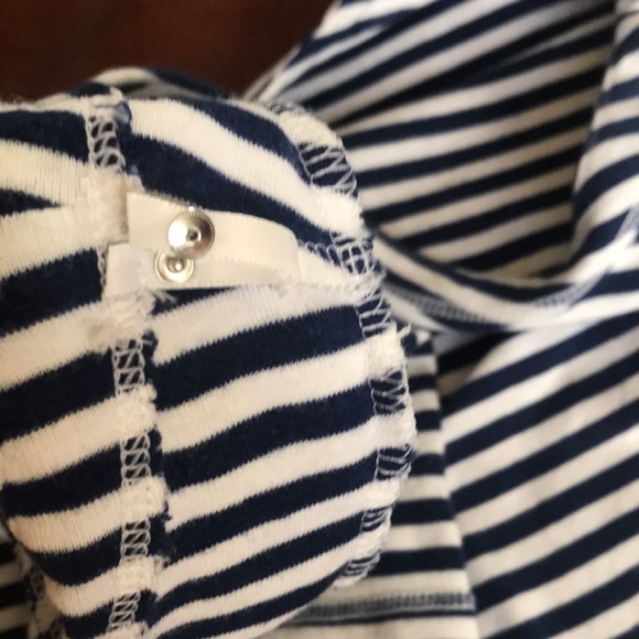 Navy and white, striped, boat neck tee with scoop back and half sleeves