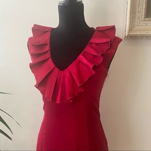 CUE Vintage Midi Dress Dark Red Ruffle Trim Cotton Viscose Elegant Classic 8