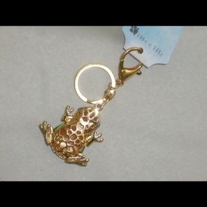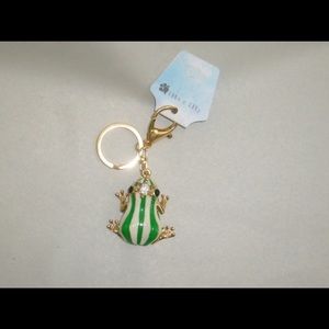 To clip onto purse, backpack,etc. 1” Split ring for keys. Frogs body is enameled and green and white stripes outlined in gold. Gold legs and feet. Eyes