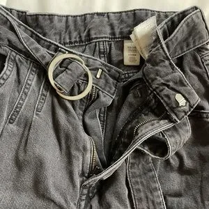 Ashy black, front & back pockets, comes with a belt but can be removed, wider in the hips, ankle-length