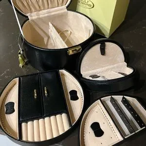 Top handle, multiple compartments. A refined case and home for your precious jewelry and heirlooms. Travel with it makes safekeeping your jewelry whilst on the go a snap.