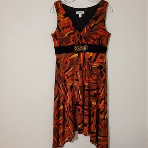 DRESSBARN ORANGE/BLACK FIT & FLARE ASYMMETRICAL SURPLICE SLEEVELES SZ 10