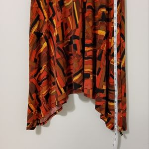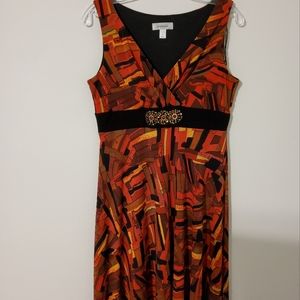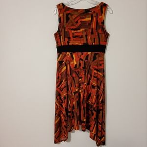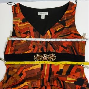 Pre-owned in excellent condition! Dressbarn Orange/Black/Red/BeigeBrown Geometric Print Fit & Flare Asymmetrical Surplice Sleeveless Size 10. See more photos for measurements, fabric contents and care for instructions! Smoke Free Home! :)