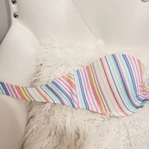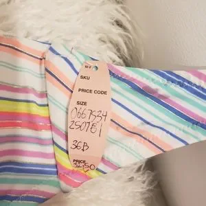 Size 36b underwire and padding. Missing the strap so must be worn strapless. Really cute..has a red mark on front, unsure if it could be blotted out with rubbing alcohol. Also has spots on side under armpit. All shown in photos. Please view all photos to make your own assessment. Has tags, unsure if new.
