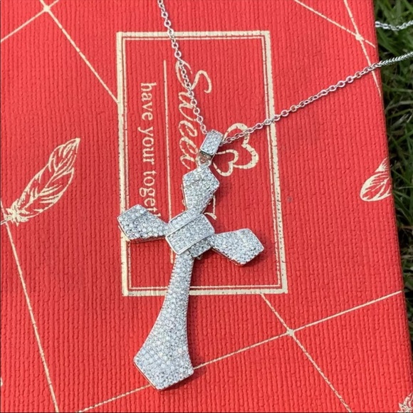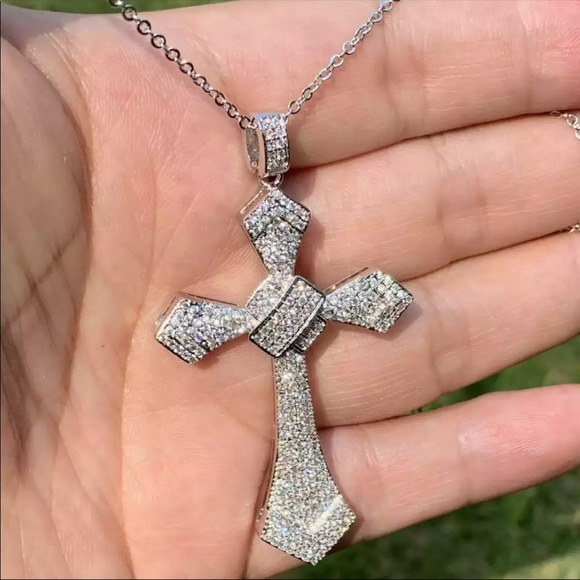 New Women’s Men 925 Silver Big Cross Diamond Necklace