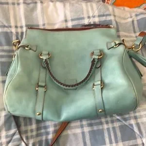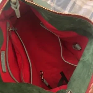 Good condition has a couple of marks on bag see photos for details. Comes with strap and identification card has gold accent trimmings nice size bag can fit a lot in bag