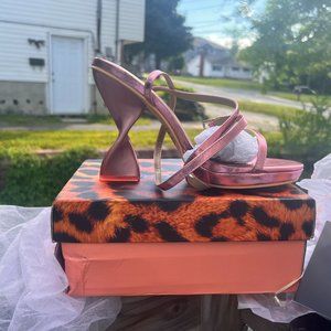 The Kelly Pink Sculpted High Heel Sandals sure knows how to put a twist on your party 'fits! Metallic faux leather creates an open-toe upper with a slender strap, a 0.5" toe platform, and wrapping ankle strap that secures with a silver buckle. The eye-catching twisted sculpted heel finishes the look!
