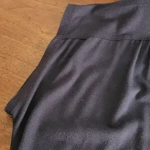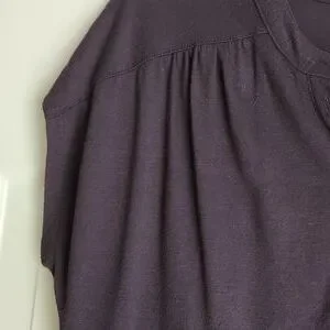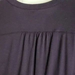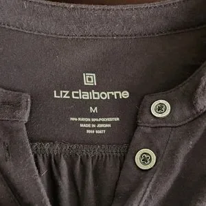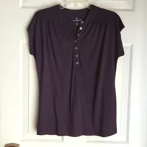 Liz Clairborn, Women's Medium, Dark Navy Top, with a Fold Over Cap Sleeve. There is a Double Stitched Line All Around the Sleeve Opening. The Band Created measures 0.50 inches.( See Photos 2, 5). There is a 0.75 inch Navy Band Around the neck with Top Stitching on All Sides of the Band. There is a Buttonhole at the Neck.