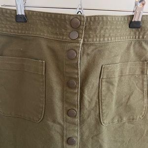 Madewell Green Denim Raw-Hem A-Line Mini Skirt! A fresh update to the 70s A-Line skirt, this stretchy mini has a raw hem for a cool DIY feel. Full button front with two side pockets. Size 8. Gently worn, in great condition!