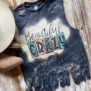 This tee is hand cut into a tank by removing the sleeves, cropped approx. 3-4” from the bottom and fringed. This will leave a raw hem.