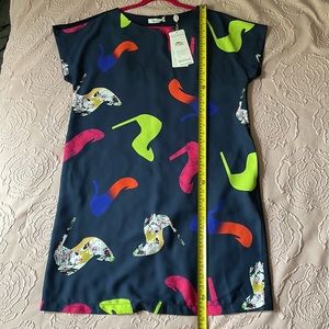 Brand “Marisis”. Dark blue dress with printed colored heels; golden buttons at the back. It has pockets. Size L . Measurements provided . Brand new with tags.