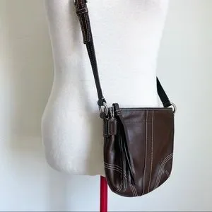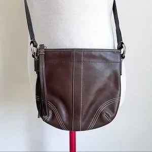 Coach crossbody purse. Dark brown leather with topstitching details. Adjustable strap. Zipper with leather tassel and Coach tag. Very clean interior with one zip pocket. Great condition!