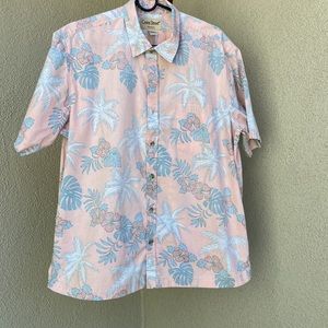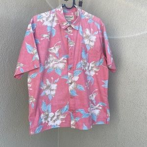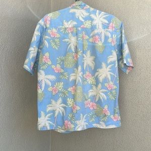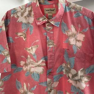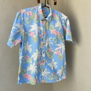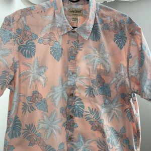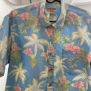 Set of 3! Cooke Street Honolulu Hawaiian shirts- all the way from Hawaii 🌺 Light pastel palette. Salmon with cream, light brown hibiscus and blue leaves. Light blue with pink hibiscus and green palms. Pale pink with blue palms. Button up, 7 buttons. Good condition. No rips, stains or tears. Smoke free home. 100% cotton. Length is 28. Width is 24.5 inches. Sleeve length 10 inches. Great for summer!
