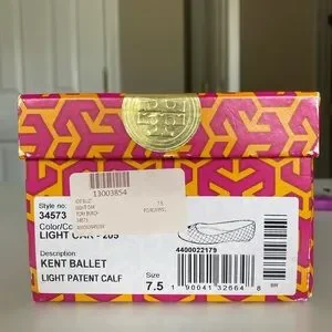 Good condition Tory Burch Kent quilted ballet flats in Nude patent, size 7.5. Outside shows focal discoloration on left toe, minor thread fraying, and the left shoe insert needs to be repaired (see photos). Comes with box.