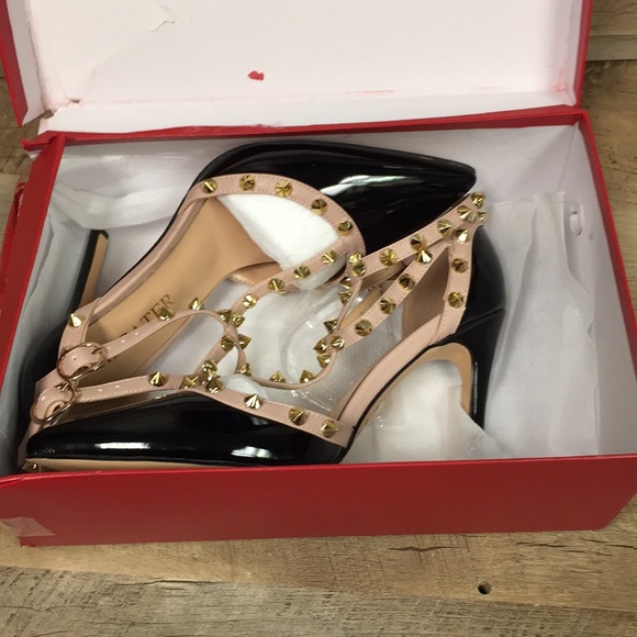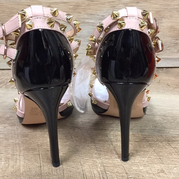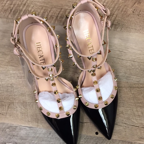 Hecater Ankle Strap Studded Patent Faux Leather Black and Cream Heels