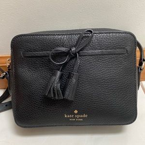 Adorable black pebble leather Arla Crossbody Bag from Kate Spade with gold hardware and pink interior. Super cute bow tassel on front with snap phone pocket. Strap is adjustable. Interior is light pink with signature spade pattern and zip pocket. As you can see pictured, there is a tiny mark on the lining of the bag. Other than that, purse is in excellent condition! I only carried it a few times…it’s just too small for my liking. Corners and exterior of bag really have no visible signs of wear. No dustbag, but will include retail bag. 8”L x 2.5”W x 6”H
