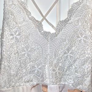 Lace crochet v-neck backless upper with stretchy adjustable spaghetti straps & a silky lining. Flowy pale pink chiffon floral bottoms with zipper in back.