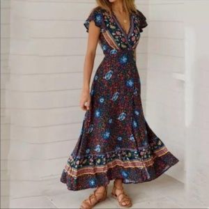 Boho Gypsy Floral Print Wrap dress Cottagecore Navy Blue
