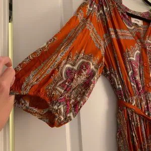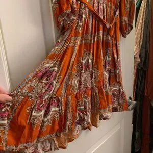NWT porridge label. Vibrant orange and multicolor paisley print dress bought from Anthropologie. Button up top and flowy skirt with tie and loops around waist. Soft silky material. Great dress for dancing!