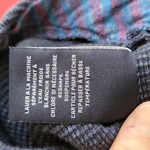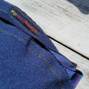 Heavyweight layering shirt is perfect for fall! Classic navy, with pops of red at cuffs and collar. Split shirt-tail hem with blue and purple striped insert.