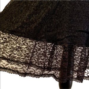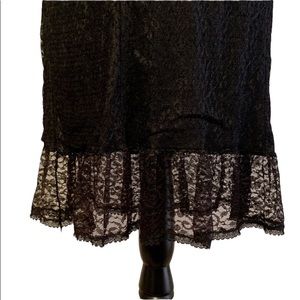 Vintage 50s-60s sexy black lace full slip. Black nylon underlay with black lace overlay. Delicate lace neckline trim, satin adjustable straps, lace ruffle hem. Material has decent amount of stretch. Original neckline has been mended, was like this when purchased in the 1990s and has held well. No Tag. Can be worn as slip, or nightie.