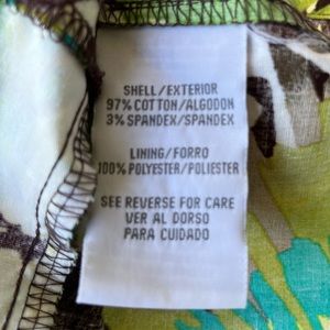 This is a super flattering halter style dress from R&K Originals, ladies size 12. The woven fabric, 97% cotton/3% spandex, has an abstract floral pattern in tan, brown, yellow, turquoise, and shades of green. Features a high neckline with snap closure on the back of the neck strap, hidden side zipper/hook&eye closure, front pockets, belt (I think a coordinating scarf around the waist would also look great đ) and a slimming Fit & flare silhouette. Youâll love the way this dress makes you feel!