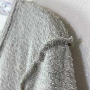 Anthropologie Maeve Dress Patchwork Linen Blend Raw Edges Nubby Women M, swing shape, cream with light gray undertone, mixed fabric, stretch knit, empire waist seaming, hem is shorter in the front, very good condition, knit: tricoter 100 cotton, woven 100 linen
