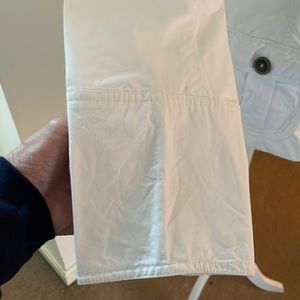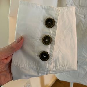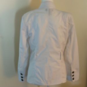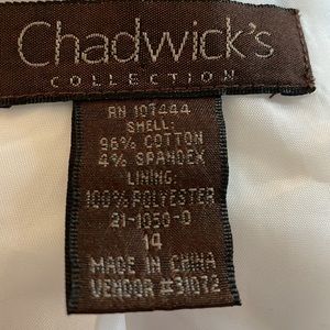 Chadwick's Size 14 Safari/Military style utility jacket with Western inspired yoke at shoulders in cotton spandex. Mock neckline with hidden snap closure. 5 hidden brushed bronze colored metal button closure. 4 front pockets with working button closures. 2 1/2 inch wide belt loops (MISSING BELT). Fully lined (to the beginning of the seam of the cuffs) with shoulder padding. Fitted at the waist and 6 inch slit at back hem to prevent riding up when sitting. Loose, working Cavalier cuffs each with 3 buttons.